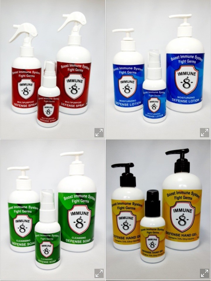 Being a single parent, working two jobs and attending college part-time, I became a licensed massage therapist and opened a massage business in Dunedin. I developed a continuing education course for LMTs, which contained information about essential oils that can boost the immune system. After the children were grown, I became a flight attendant for several years, however, I developed allergies to perfumes. Drawing from my research on essential oils, I developed a blend of eight essential oils known for their antimicrobial (kills germs) chemical makeup. As an added benefit it helps with stress conditions. The patented Immune 8 products consist of a multipurpose defense spray, defense hand gel with 70% alcohol, organic defense lotion, and organic defense liquid soap. The blend concentrate is available for diffusers.